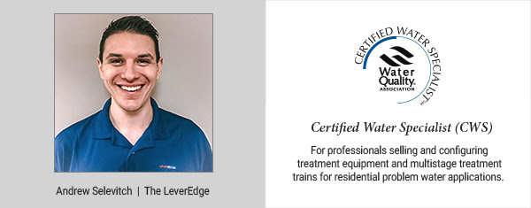 Please join me in recognizing Andrew Selevitch for completing the WQA Certified Water Specialist course work and passing the comprehensive exam. This WQA certification is a credentialing process demonstrating his commitment to high professional standards and growing his water treatment expertise.